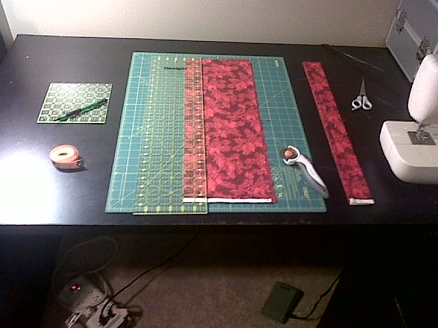 Here is one of me rotary cutting the strips for the 9 Patch blocks: