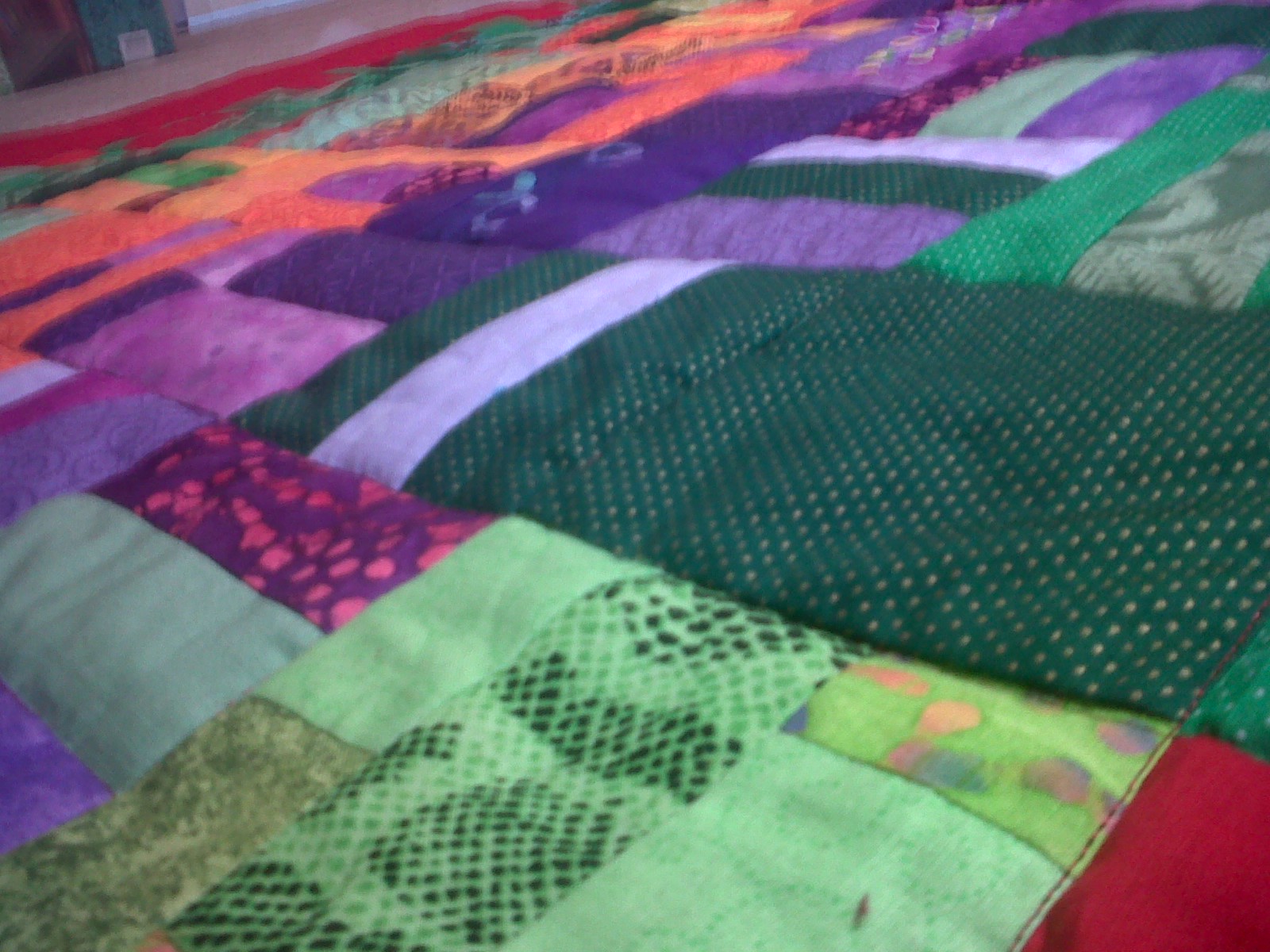 I just got home, and the first thing I did was pull this beauty out of the dryer! How gorgeous it is! I was bummed at first because I really wanted to do a bright blue binding, but the blue I had n mind I was about 6 square inches short on, and so I had to change my plans! So, instead, I used a green fabric that pops up a few other times in the quilt and I think it really just makes everything pop!