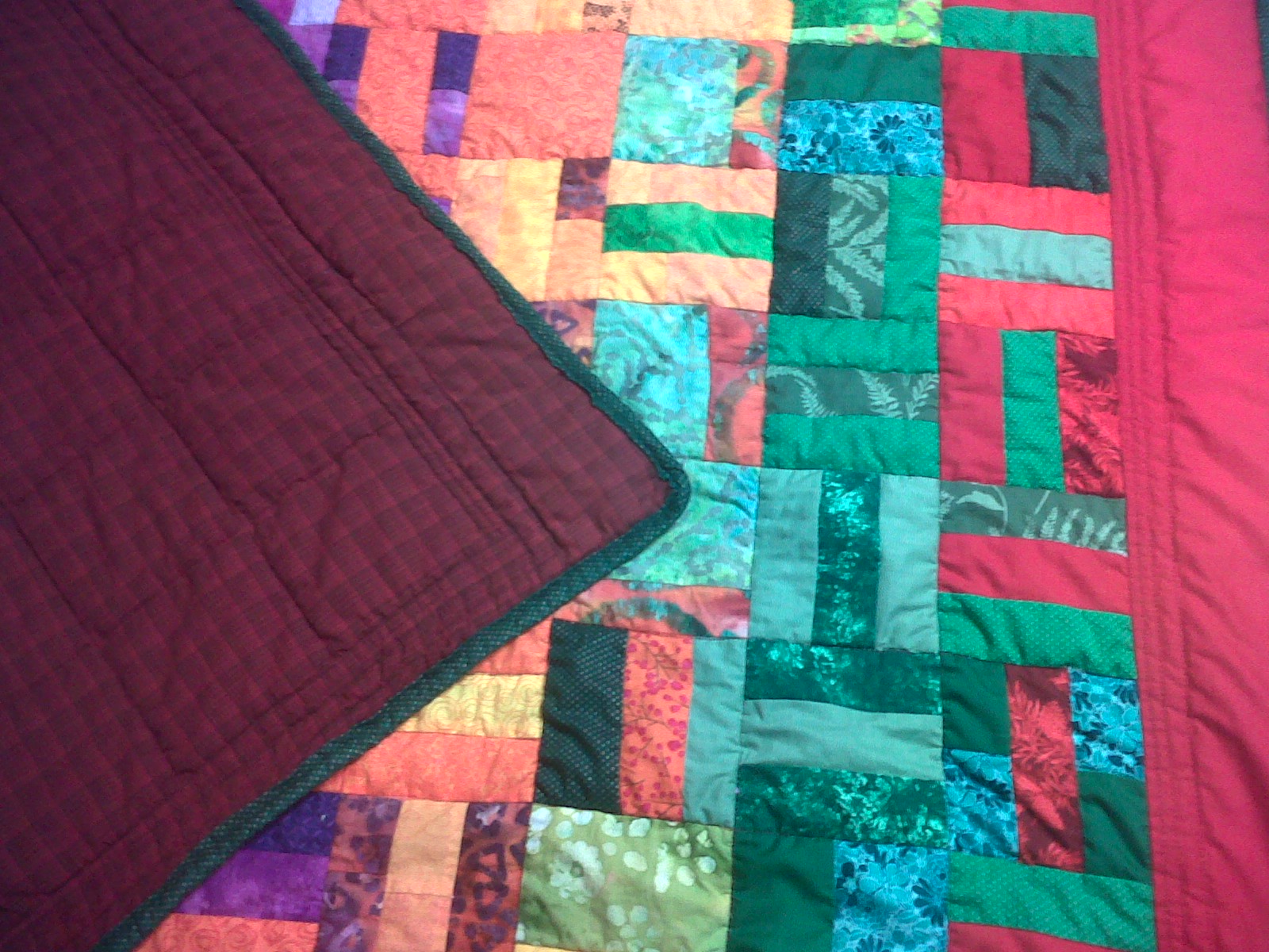 For the backing I went with a nice plaid I had lying around. It’s very comfortable, and it’s really dull and plain, which is a nice contrast to the top of the quilt, being very saturated and bright! I really love the contrast! I also like the way the green binding hits the colors of the backing! I used a nice burgundy thread on the top, and a black thread on the bottom to fade into the plaid. I’m overall very happy with the way it turned out, and now I get to give it to my nephew the next time I see hit! I really hope he’ll like it!