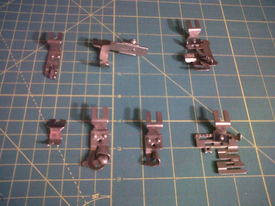 Top left is a narrow hem foot, top middle is an adjustable zip/piping foot, top right is for attaching bias binding.